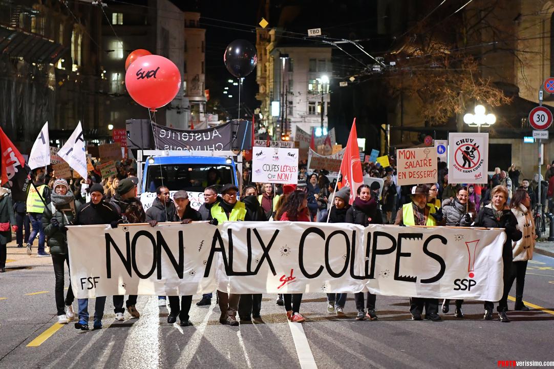 Plus de 100 lieux en grève, des dizaines d'actions et des milliers de salariés mobilisés partout dans le canton pour dire «NON aux coupes». Infirmières, enseignants, éducatrices, étudiants, enfants, ce mardi 18 novembre, ils étaient plus de 15’000 à manifester leur mécontentement dans les rues de Lausanne, contre les coupes budgétaires prévues par le Conseil d’État. Parti de Montbenon, le cortège s’est terminé sur la place du Château. Selon les syndicats «D’autres actions auront lieu si nécessaire».